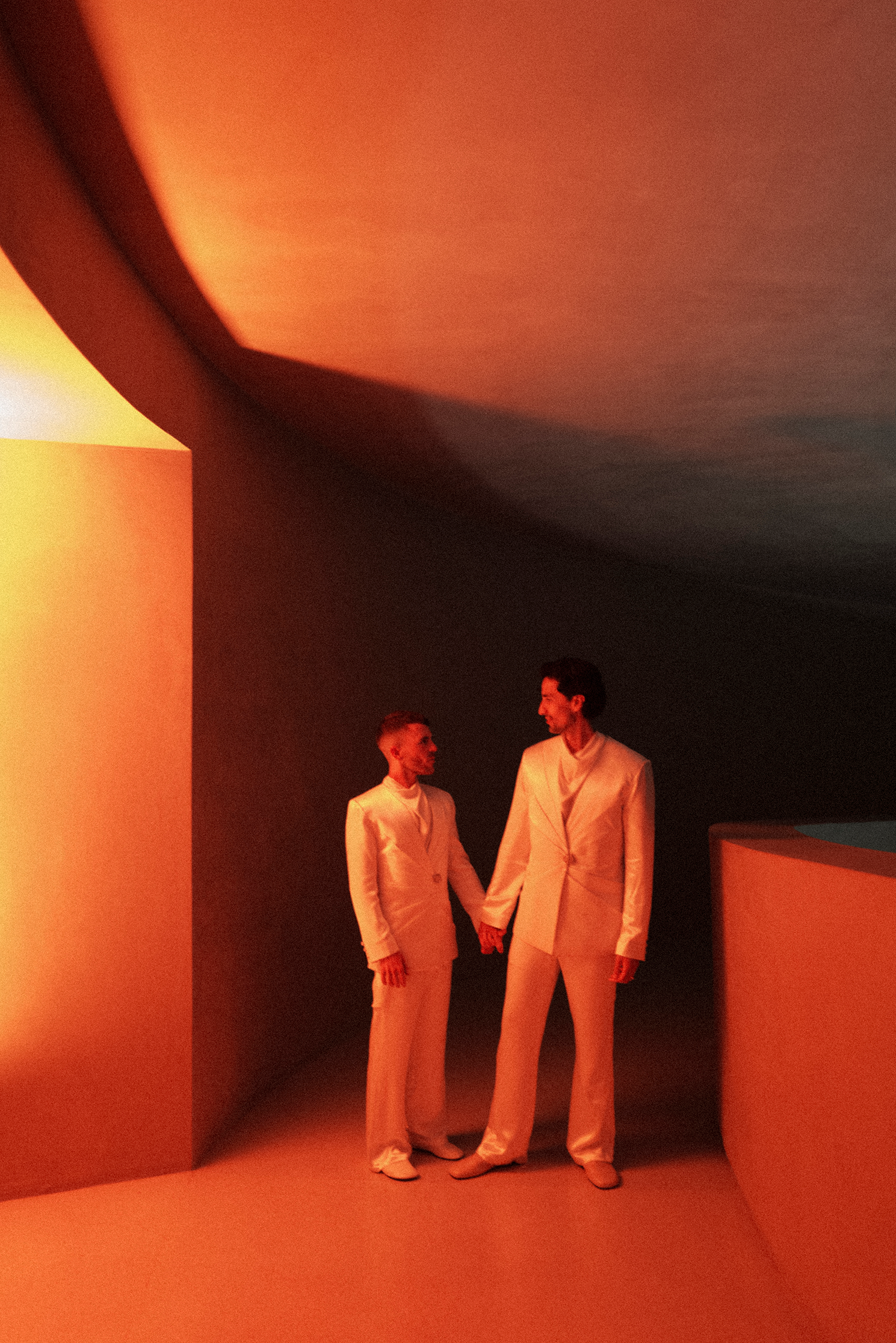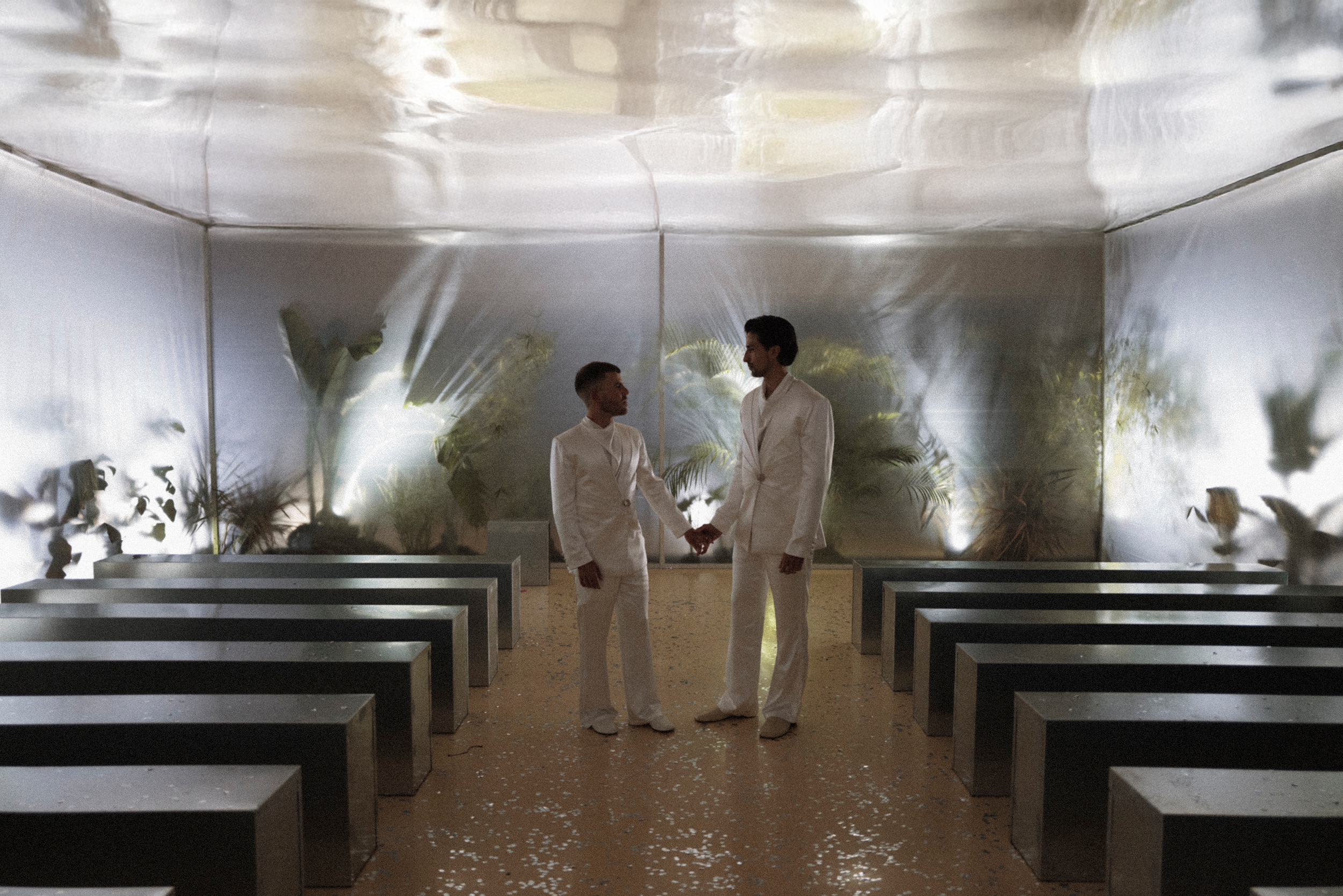 Carlos and Gerardo’s wedding at Herdade do Freixo, in the heart of Alentejo, and 40 meters below the ground, was an exploration of the unexpected. Guided by two bold principles: the raw, sterile effect of steel, and the strange beauty of aquatic, carnivorous, and tropical plants. The day unfolded as an immersive artistic experience rather than a traditional celebration.