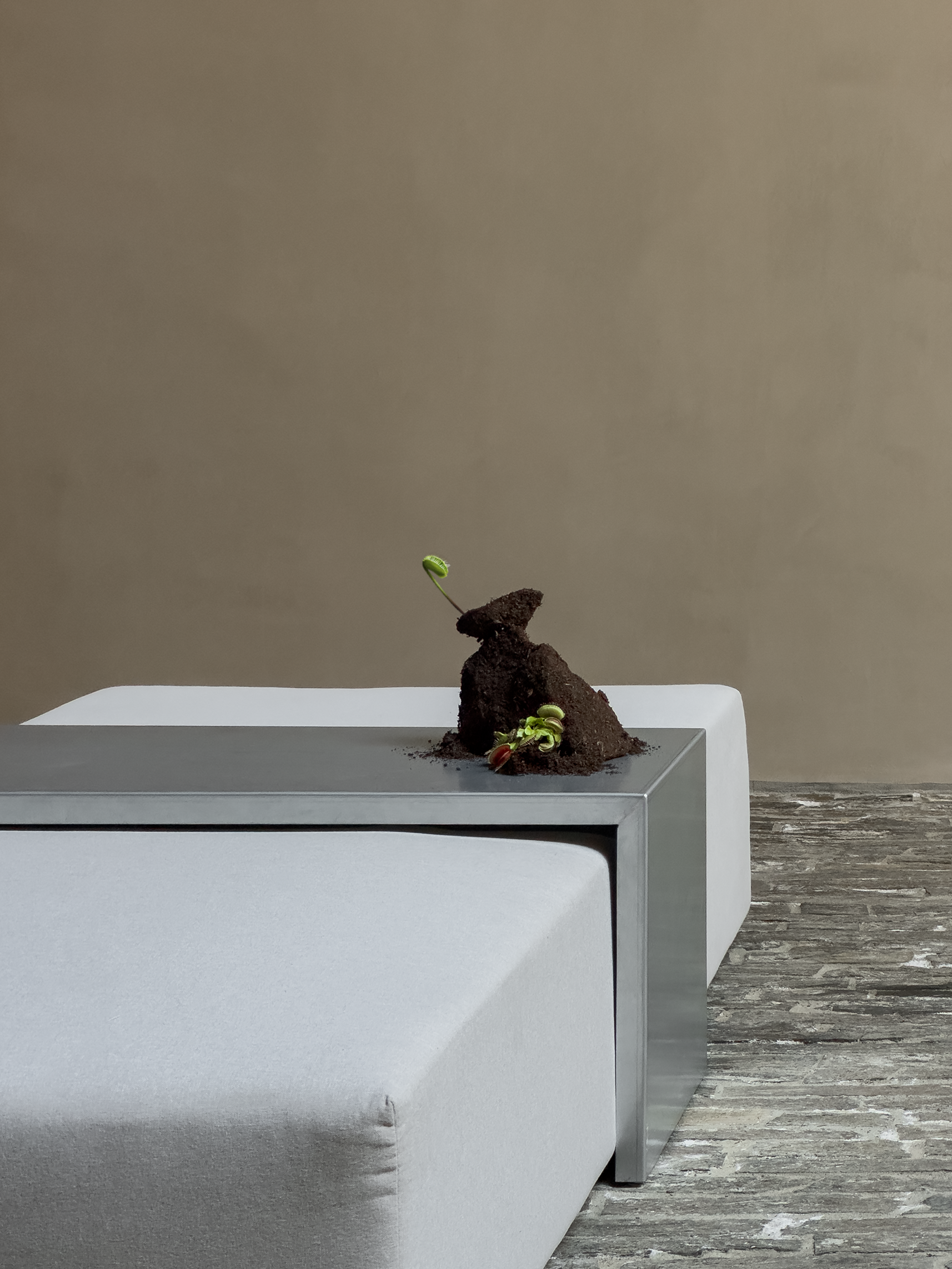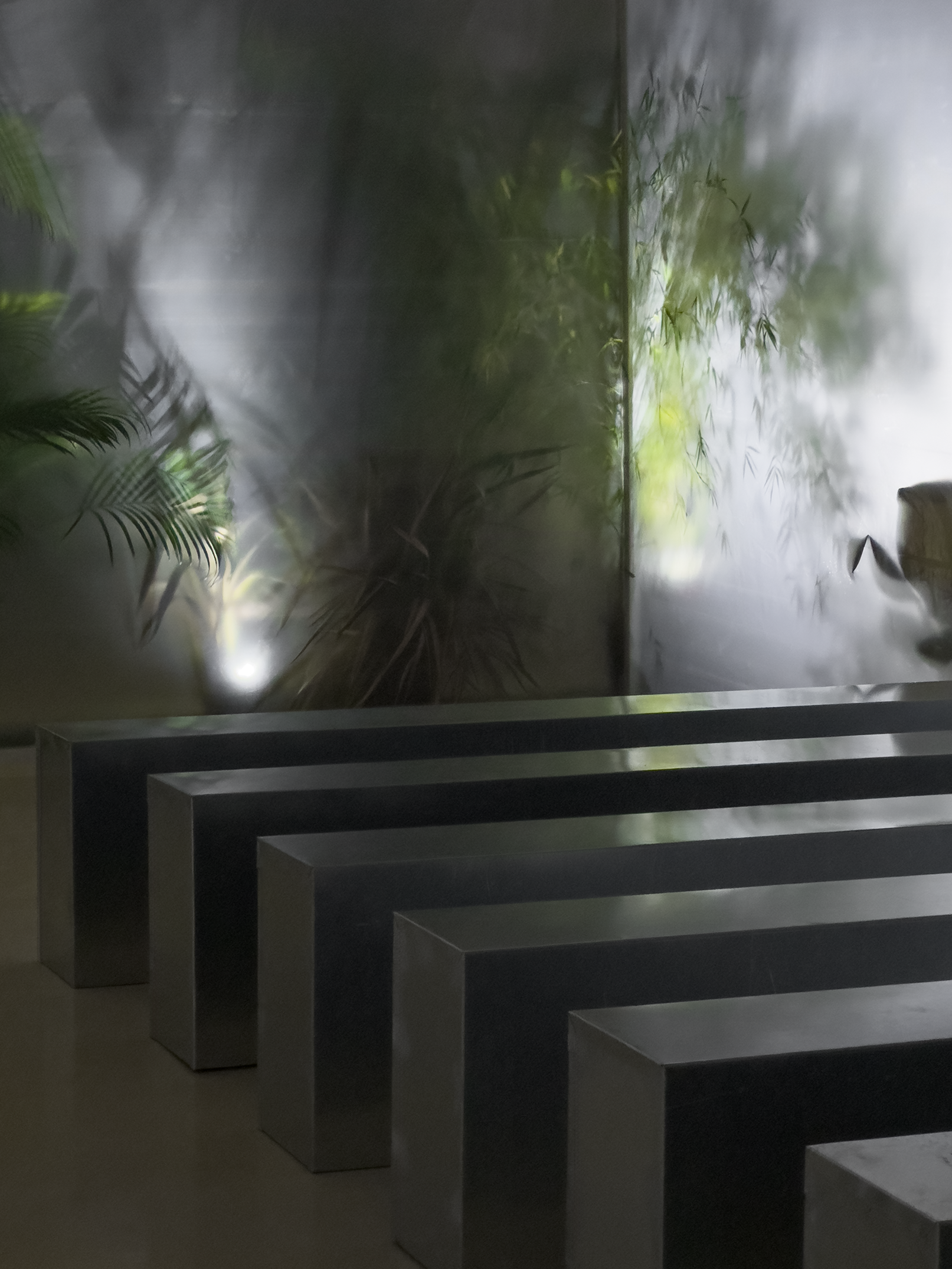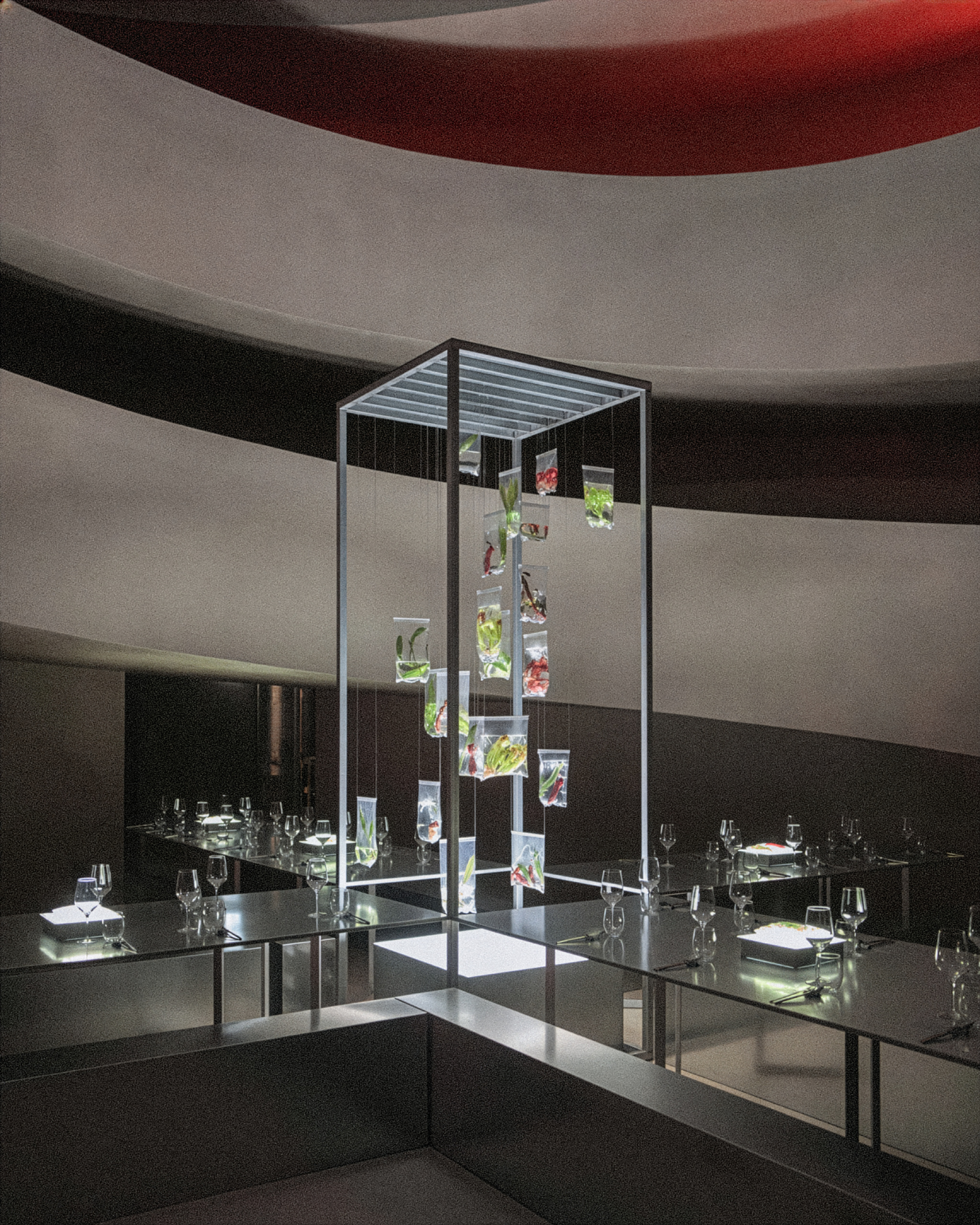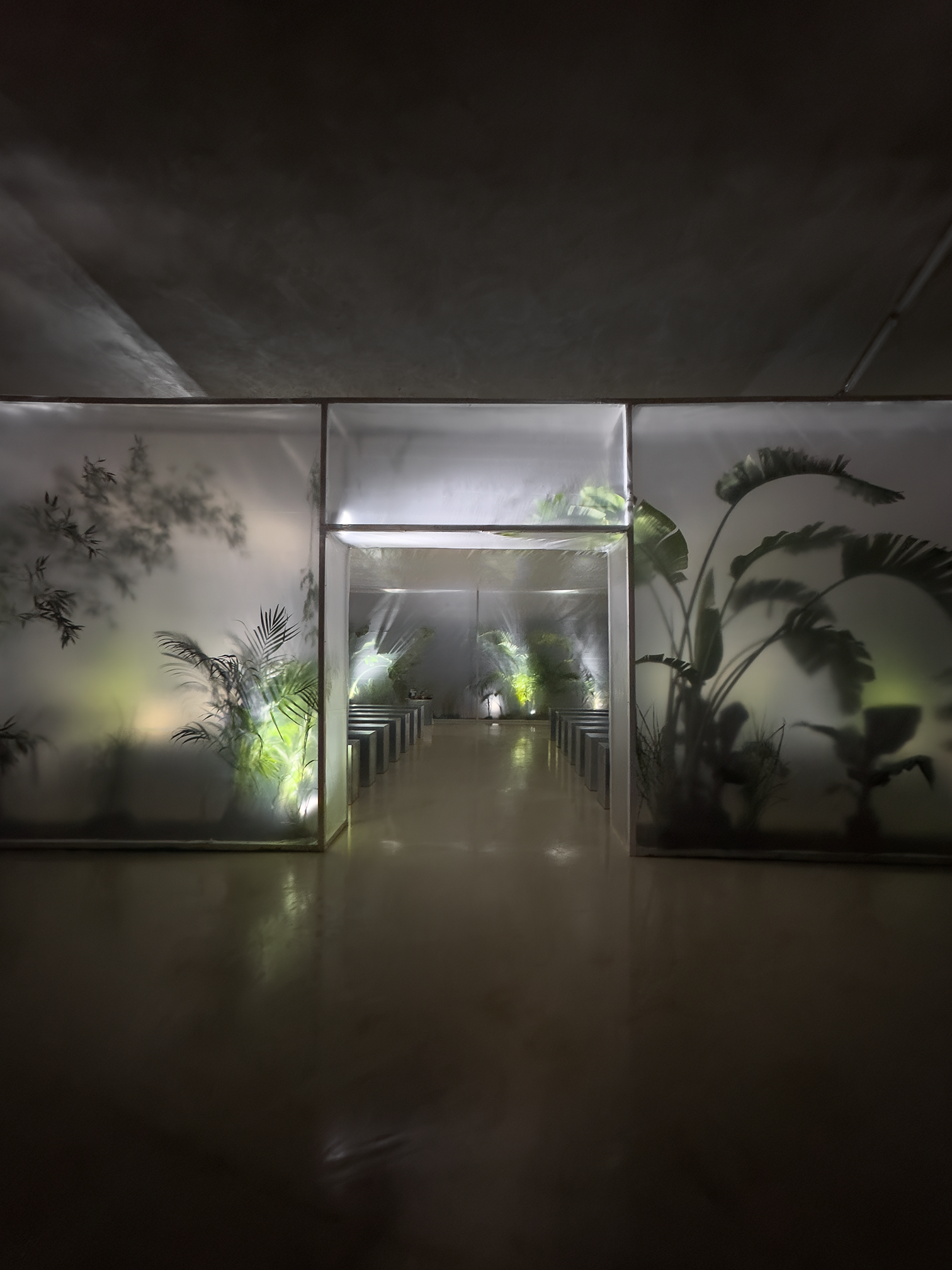 Together with Tales, we envisioned a concept that blurred the lines between nature and futurism, crafting moments that challenged perception and engaged the senses. The ceremony embraced shadows and white noise, creating a sculptural atmosphere where light and sound became a living artwork, welcoming each guest. The cocktail introduced the couple’s favourite flora, carnivorous plants, transforming the space into a surreal installation where nature’s monstrous forms invited discovery and reflection. Finally, the dinner embraced minimalism infused with a brutalist sensibility, where steel structures intertwined with aquatic and carnivorous plants, turning the table into a stage for an extraordinary dialogue between material and life.