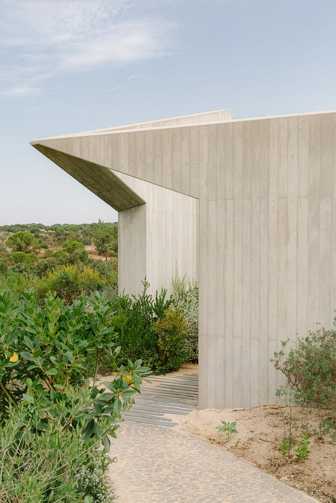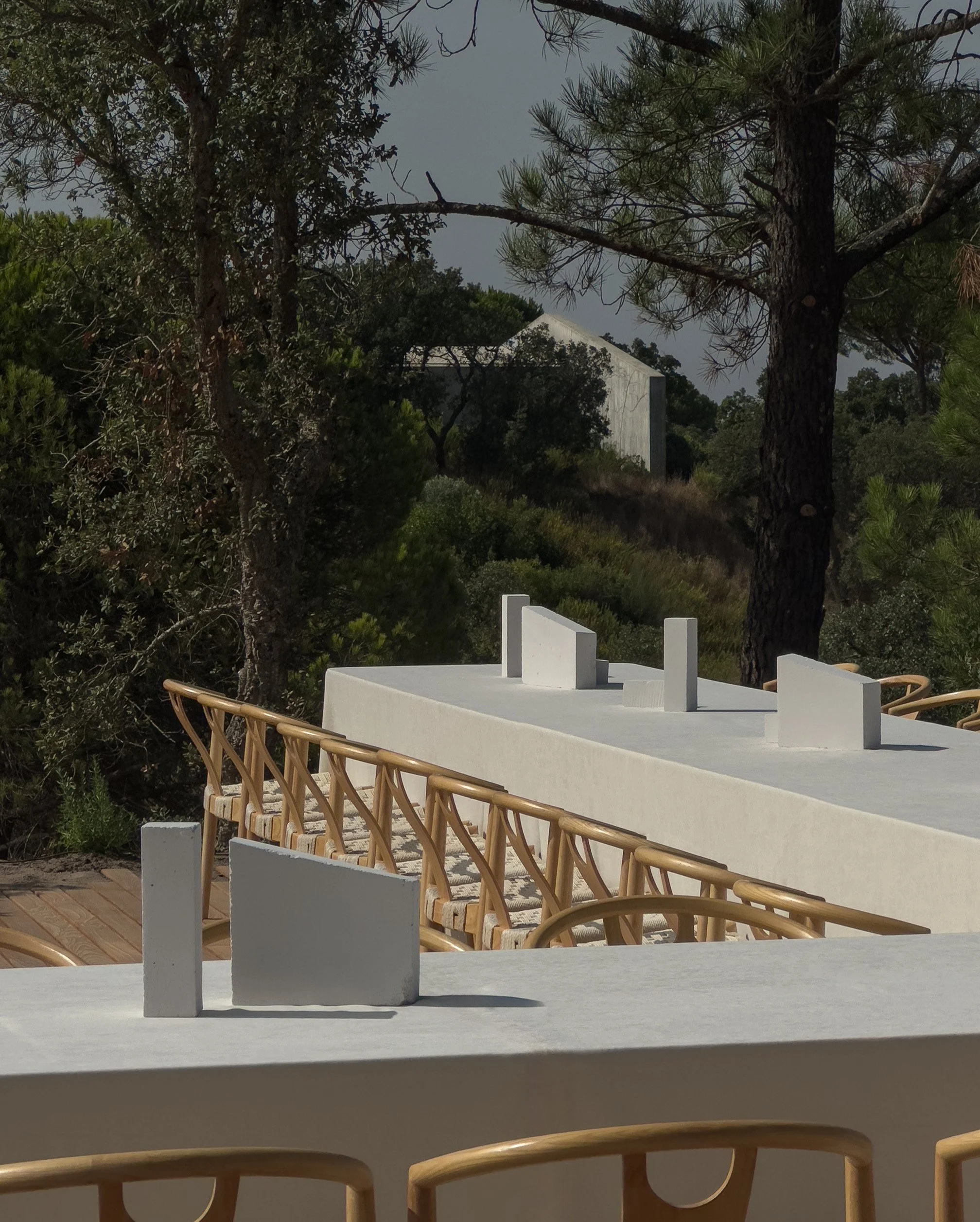 For the dinner, we followed the architectural language of the Pa.te.os Main House. Inspired by the defining material of the space, concrete, we designed small geometric forms that echoed its sculptural presence. These minimal, tactile elements subtly reflected the surrounding environment: earthy tones and the unique nature of Melides. The result was a moment where architecture, landscape and affection came together in perfect balance.